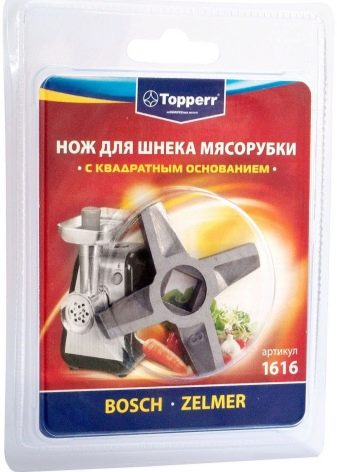 Due to the difference in the forms of the base, the element can be difficult to choose for a specific model of a meat grinder. In addition, some manufacturers produce different types of knives for various series of meat grinders. So, a popular brand Moulinex meets the base "hexagon" and "square". Zelmer offers accessories only with a square footprint. Bosch, Braun, Kenwood, Gorenje also made with a square base.