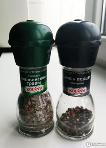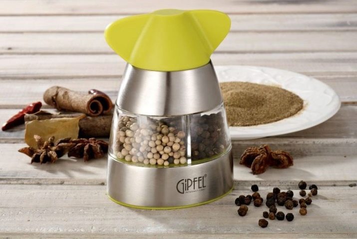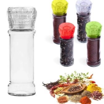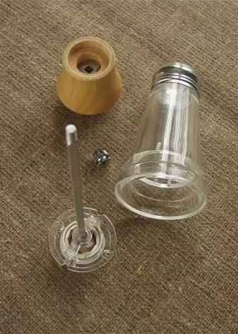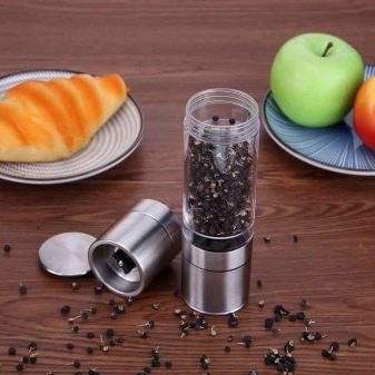 Capacity is often made of transparent materials., which allows you to visually track the number of spices inside the mill. Inside the case, at the border of the two compartments, millstones are located, which are a gear mechanism, during the rotation of which grinding of various types of salt, pepper, seasonings and spices takes place.