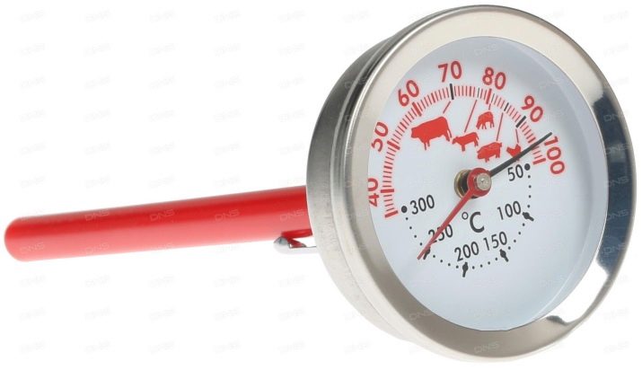 Analog (they are mechanical, bimetallic, spring, switch) thermometers are equipped with a stainless steel probe (from 8 to 20 centimeters) with a measuring element integrated into its tip. This type of device operates according to the method of expansion of bodies from increasing temperature. There are 2 scale options.