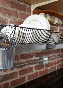 In this option, design and placement are felt. mounted drying in a rustic style. The design involves placing plates in itself, but experienced housewives will be able to place glasses and cups in it. The drying bottom is made of a stationary tray with holes through which water flows.