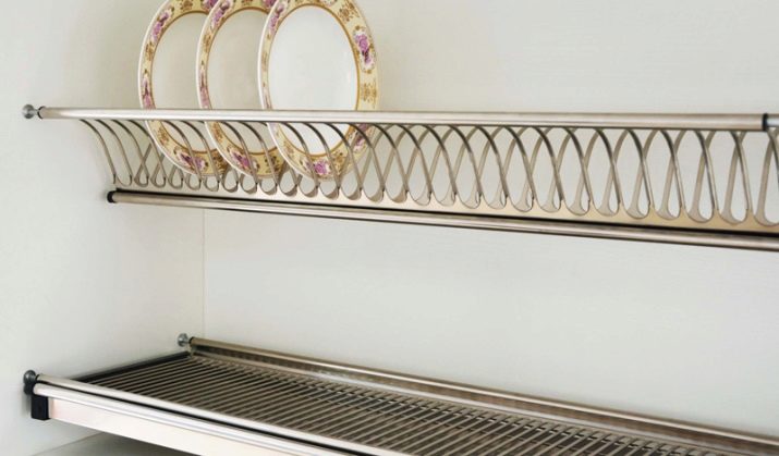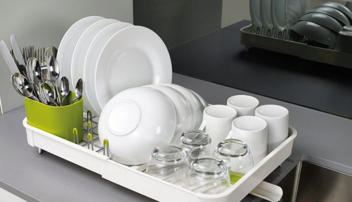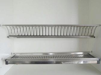 In addition, built-in dryer designs can be both stationary and retractable. The simplest models assume the presence of two tiers, one of them is for plates, the other for mugs and cups. A special pan is placed below, into which water flows.