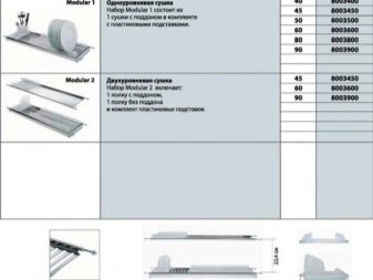 Modern hinged dryers for dishes are made taking into account the volume of essential utensils and free space in the kitchen, that is, they have different sizes.