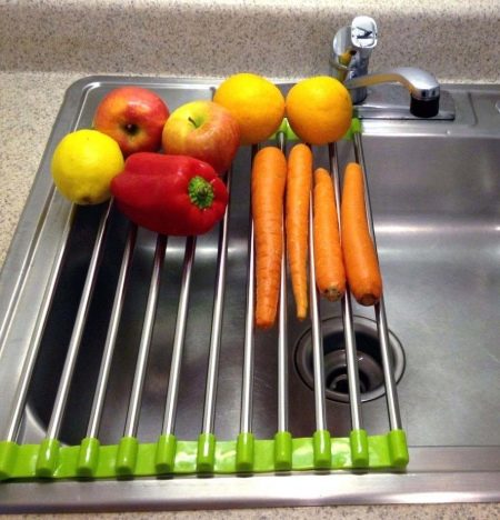 An unusual version of the drying device is made according to the type of mesh, grate, or perforated board. Basically, the product is made of stainless steel, although there are plastic models. The device is placed on the second side of the sink, so that its edges go into the sides of the sink. Water draining from the dishes, straight into the pipeline.