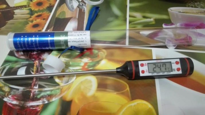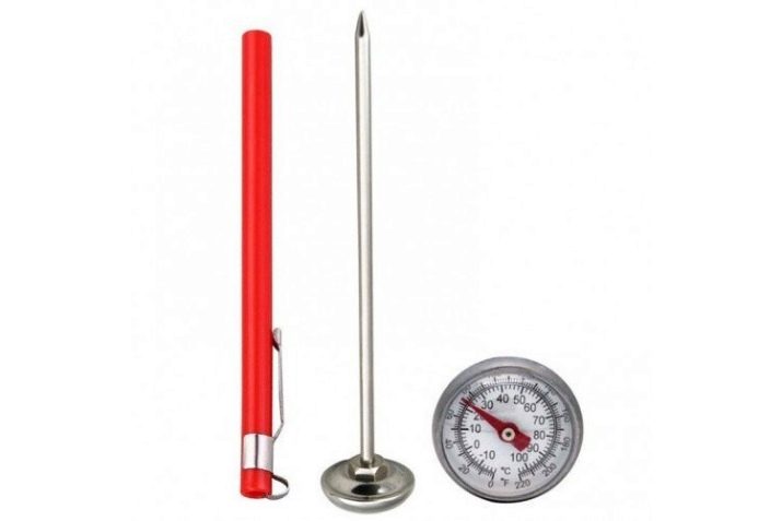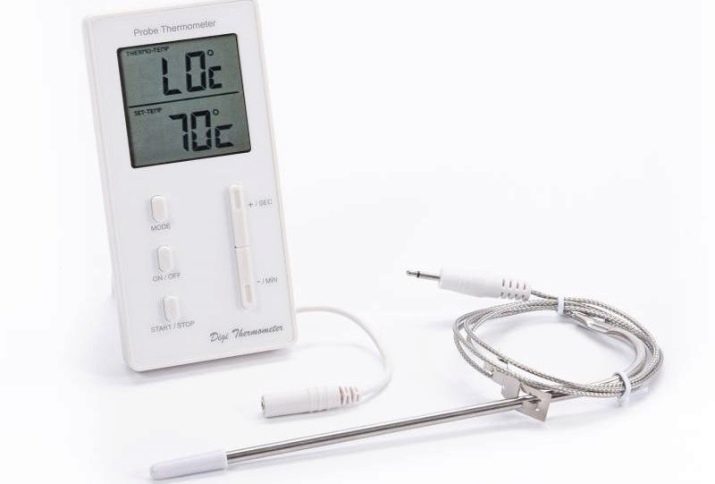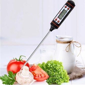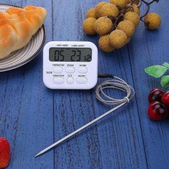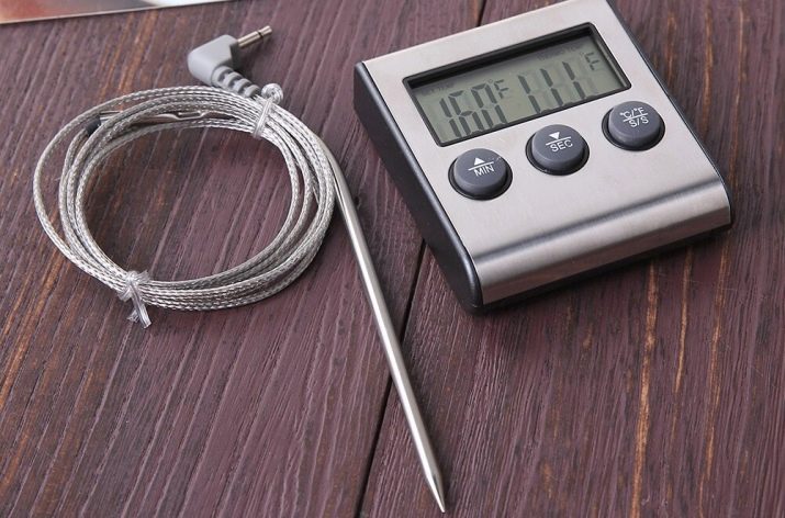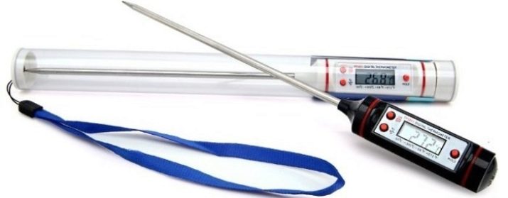 Quite often, a wireless immersion thermometer (otherwise called a probe-needle) is used. Externally, this device looks like a display device equipped with a steel spoke. Such a device is very convenient to use. Wireless systems are always at hand and, if necessary, can be used to measure the temperature of all dishes. A feature of the model is a plastic case.