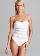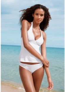 The upper part of white swimwear - a bando is often decorated with ruffles, including lace. This perfectly masks excessive thinness, accentuates the chest, visually increasing it by a couple of sizes. For all these reasons, bandeau should not be worn by lush women.