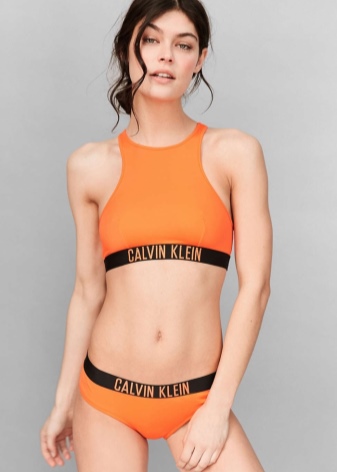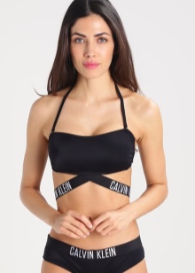 Brand products are complemented by large brand logos. This addition is used not only in the creation of bathing suits, but also in the manufacture of underwear. There are very original products in which a wide band with a contrasting brand name is located on the straps that cross each other.