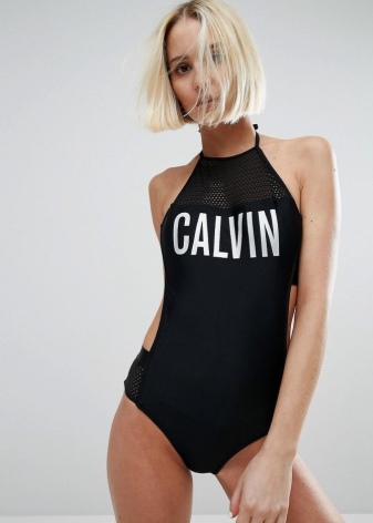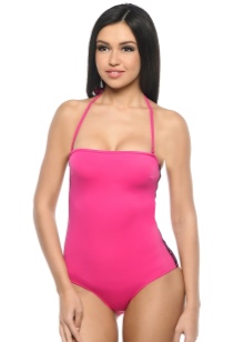The famous brand produces very comfortable and beautiful one-piece suits with both open and closed backs. There are instances on wide straps or more resembling a usual sleeveless jacket.