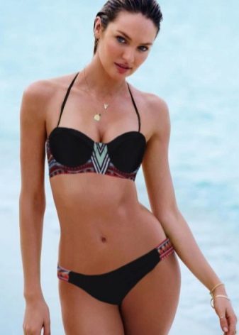 - Bando - the bodice of this swimsuit looks like a wide strapless stripe - it can be either simple or twisted, with a knot on the chest, with a decorative half ring in the shape of the letter U, or a ring in the center. To better support the chest, tie a neck strap to such a bodice. If you want an even tan without white stripes, then it is better to refuse them, or circle them around the body, fixing with a bow.
