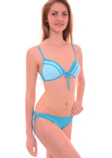 - Bright blue. Swimwear of this shade is advised to purchase girls with dark skin. Even a laconic model without additional decor looks amazing in this color. It can be supplemented with a snow-white or bright pink cloak, this combination looks very bright and suits bold ladies. Very popular models of Victoria’s Secrets Triangle in neon blue. Such a swimsuit is decorated with a contrasting edging, the image is very bold and bold.