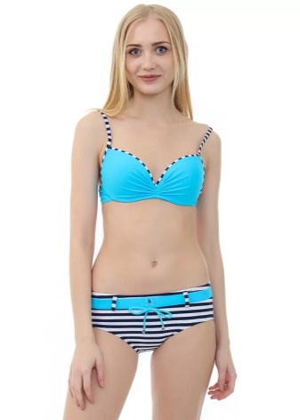 - In a marine style. The combination of blue and white never goes out of style. Such swimwear is appropriate for beach parties and boat trips. In addition to a white pareo, you can create a very elegant look.