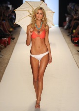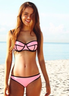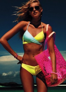 At the peak of popularity are mini-bikinis, which are presented in fashion collections in a wide variety of colors, mainly: neon shades of yellow, green, orange and pink. The bras of such swimsuits, as at all times, are indicated by small triangles covering the nipples. Great for tanning, as it takes up a minimum of space on the female body.