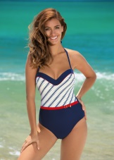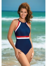 Sports models of swimwear are made in traditional colors: blue, white, black and red. As ornaments used contrasting color stripes.