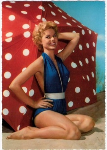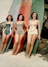 Women's beach fashion of the 50s was not yet ready for sexy monokini or spectacular thong panties, but tried to emphasize the girl's shape most vividly. Designers deliberately focused on the décolleté line, lifting their breasts with a push-up and decorating the cups of the bodice with various coquettish details. Panties separate swimsuit performed at high or medium waist.