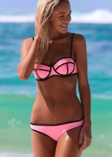 - If you have full hips, you can choose a swimsuit consisting of dark swimming trunks and a bright pink bodice.