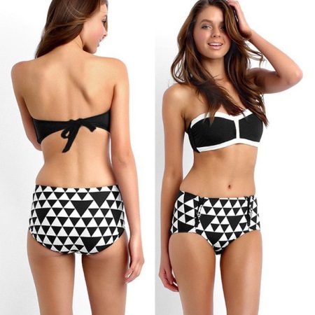 The most popular swimsuit option this summer is in retro style. Shorts with a high waistline and a bandeau top will look unusual and stylish among open swimwear.