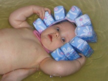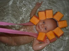 Sometimes mothers use an inflatable model. In some cases, a hat is necessary so that water does not get into the ears.