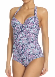 - Halter. According to experts, such swimsuits are designed for a lush bust. Thanks to the straps tied around the neck, they perfectly support the chest and make it more attractive. Such a swimsuit is ideal for the pool, because you can safely jump in it, play water games and not be afraid of an awkward moment.