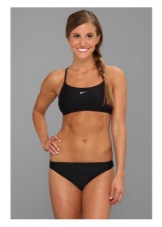 A popular model, especially among girls with a good figure. Such a swimsuit does not look like a beach version. It consists of a short sports top with straps arranged crosswise or stitched. The top tightly fits the figure, well supports the chest. The top is usually worn with sports swimming trunks or with shorts, which are also made of traction material, so they sit tight on the figure even with active movement.