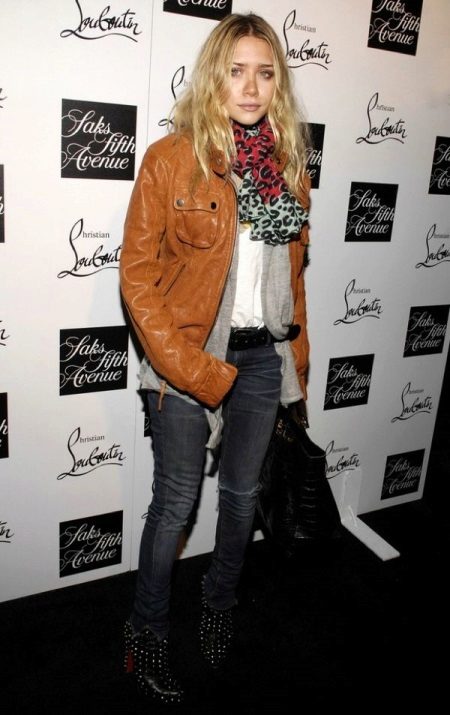 Sisters Ashley and Mary-Kate Olsen love multilayer images. A bomber jacket worn over a black top and a gray cardigan looks interesting and unusual. Sunglasses are a great addition to a stylish outfit.