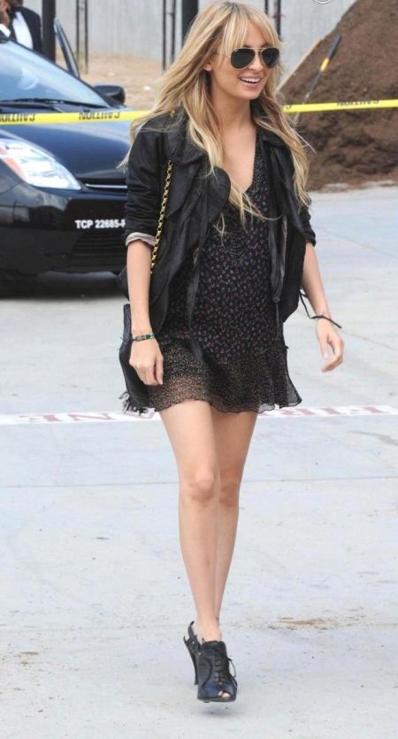 If you choose an image for every day, take an example with Nicole Ricci. She prefers black total-look, combining a bomber jacket with leggings, a tunic, a bag and high-heeled shoes.