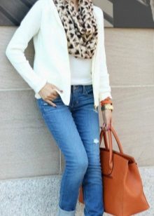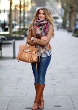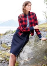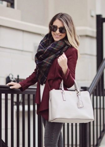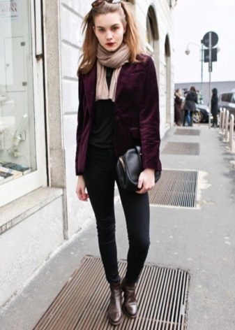 The best option for printing is an English cage, a combination of textures and drawings is acceptable. The main thing is that in a bow with a checkered jacket there should not be any other similar things. It is better to choose plain jeans and shoes and a minimum of accessories.