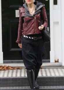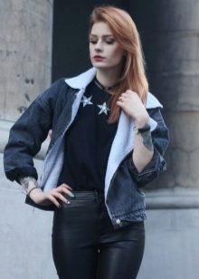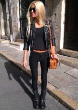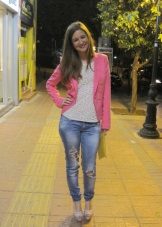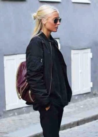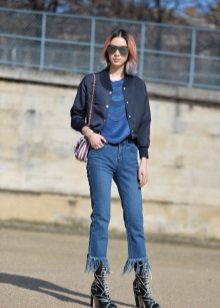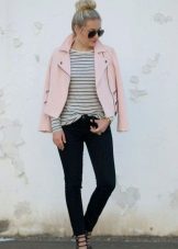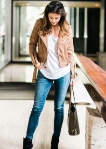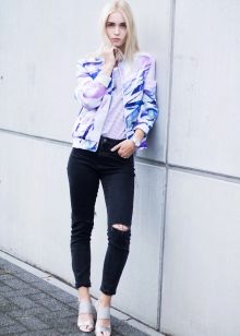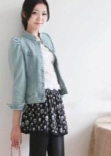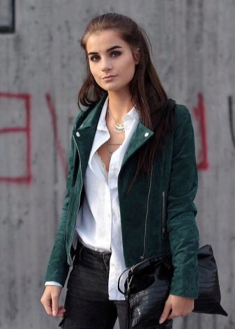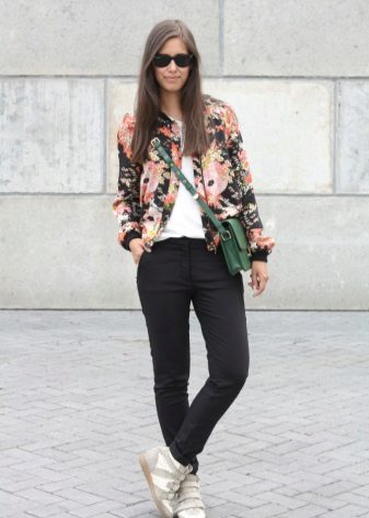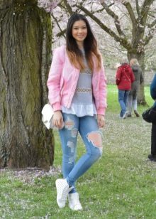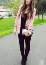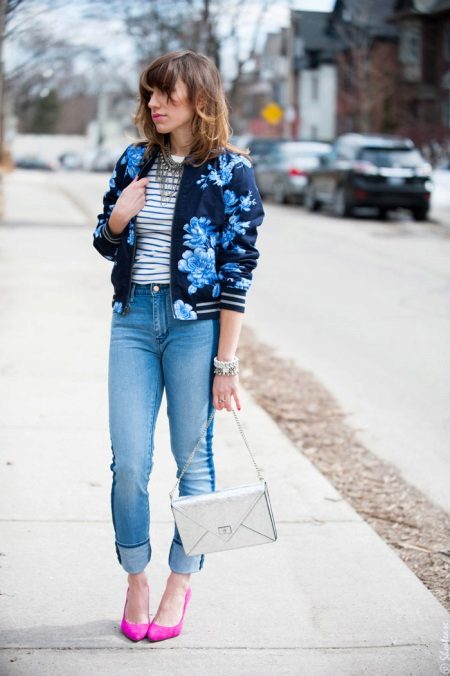 If it is made in a casual casual style or in leather in a sports style, then jeans of black and classic blue will perfectly match with it. It would be nice to add shoes and a bag to the look of the jacket in this look, then you will look stylish, not allowing “overload” of color in the look.