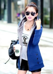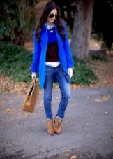 The top, although it will be under the jacket, you need to choose from light fabrics, since under the thin skin of the jacket, bulk fabric will visually add a couple of extra pounds to you. Shoes should be chosen based on your style and overall appearance. With a blue jacket, all black and blue shoes are perfectly combined - both shoes, and boats, and ankle boots. Her rise can be different - and ordinary wide heels, and a wedge, and a hairpin will be appropriate, and their height should be chosen according to the general style of the image.