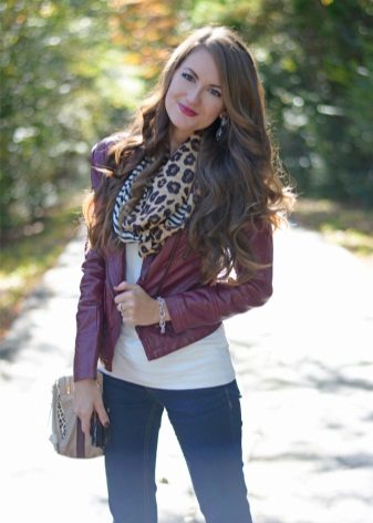 In combination with various dresses, a cropped light burgundy jacket will look very good. Since the waist will be open, the dress should choose a fitting style to emphasize the dignity of the figure. From shoes, we recommend wearing high-heeled shoes in black, or choosing other shoes to match the jacket. The final accent of the image can be made with a wide scarf made of thin fabric of the color of wet leaves, which will add sophistication and unusualness to the image.