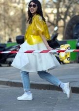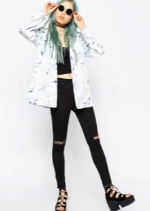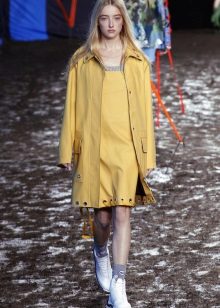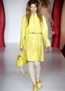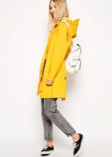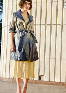 A raincoat jacket is combined with shorts, a top and rubber boots. You can add a bright accent in the form of a scarf to the tone of the jacket, if it is opaque.