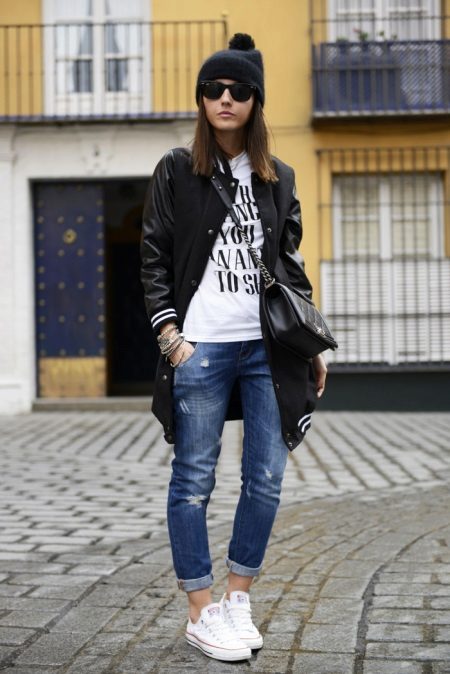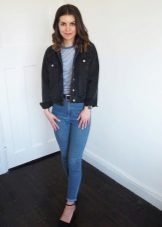 If you plan to go to work in the purchased jeans, then we recommend that you consider a strict cut model without unnecessary details. A black jacket without pockets on the chest, and on buttons instead of buttons, can quite play the role of a business jacket, and you, in your favorite clothes, will feel comfortable throughout the day.