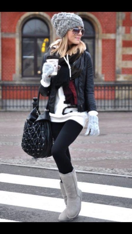 - Warm black denim jacket + woolen white tunic + gray hat and mittens made of natural wool + ugg boots to match the hat to the middle of the calf.