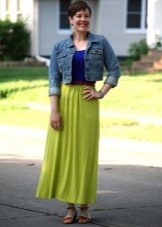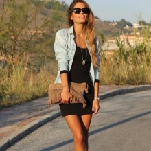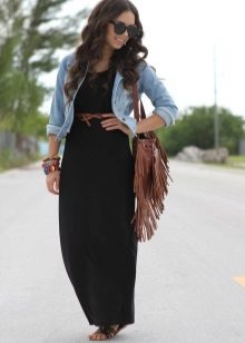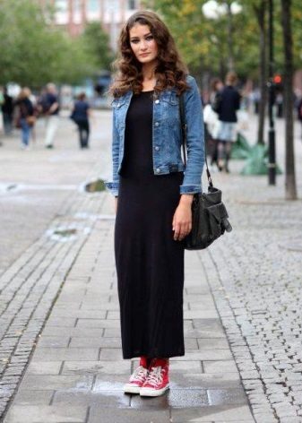 - For a stylish look, a short denim jacket in a tandem with a simple black floor dress and high red sneakers is suitable for every day. A small handbag matching the dress will perfectly complement a casual bow.