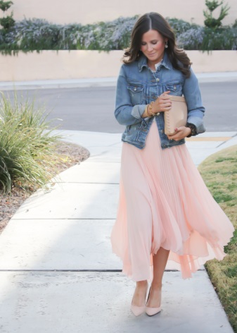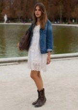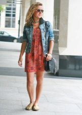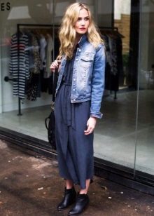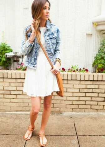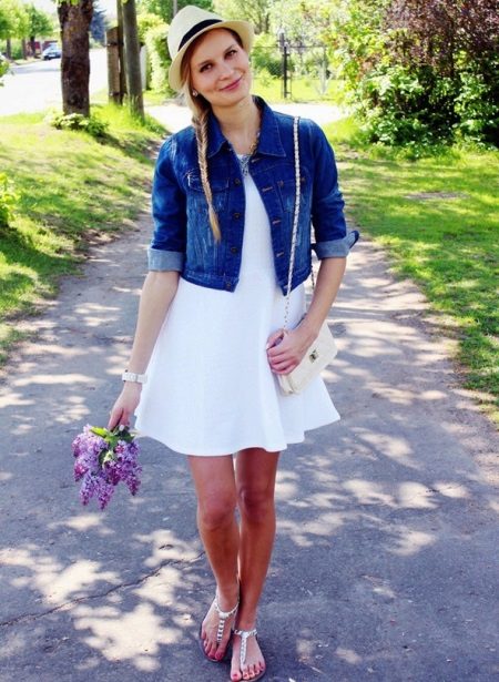 The denim jacket is perfectly combined with summer light dresses, creating a feminine, fashionable bow. Designers suggest wearing a short jacket with silk, linen, chiffon or knitted sundresses.