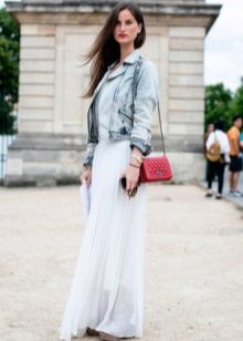 - A cropped jacket can be combined with a long pleated white floor skirt. A small red handbag will become a bright accent. Such a bow is suitable for a party or meeting with friends.
