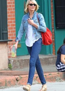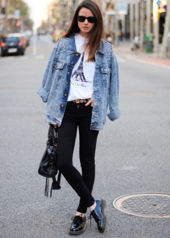 Many girls like to wear a short denim with a plain t-shirt and black pants. Such an image looks both simple and elegant. A t-shirt or t-shirt can be a bright accent in creating a bow. Stylists suggest wearing models decorated with bows, rhinestones or lace. A jacket with minimal decor will harmoniously look with such a T-shirt.