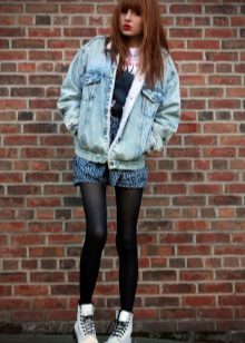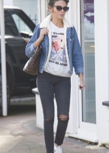 Jeans jacket models decorated with prints should become the main accent in any bow. In order to avoid "overload" of color, all other clothes in the image should choose calm neutral shades. The maximum where brightness can still be applied is jewelry - a large bracelet or ring earrings will be appropriate here. In sunny weather, sunglasses will be appropriate.