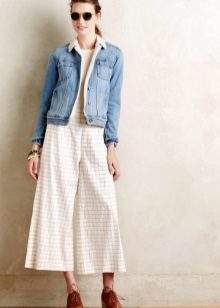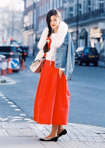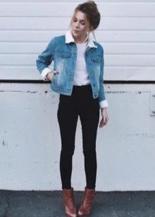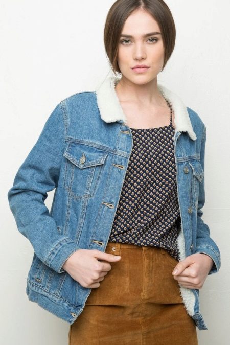 A denim jacket with additional insulation will be ideal for combining with pants made of dense or rough monochromatic material. It is not recommended only to wear it with jeans of the same color, so as not to seem dressed in a denim suit.