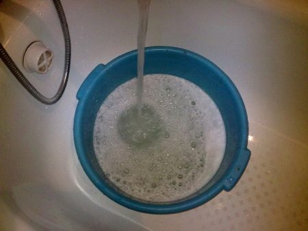 - Before starting a hand wash, remember that the process will be long, difficult and, of course, tedious. To start, fill the bathtub or large basin with water. Water should not be too hot. Dissolve the gel in it, or you can use liquid detergent to wash the laundry.