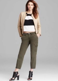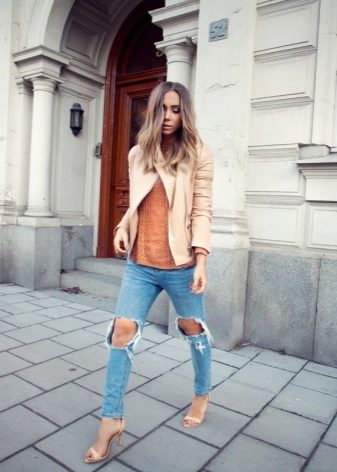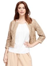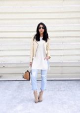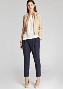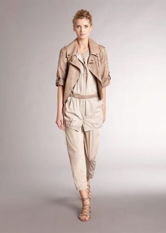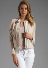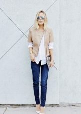 A beige jacket can be safely combined with a dress or a red skirt.Such an ensemble will give a bright, passionate image. For everyday life, a jacket should be combined with black, brown or gray trousers. A bright sweater add originality.