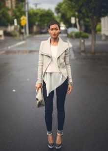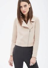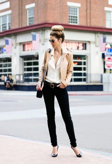 A beige leather jacket looks great with black, brown and blue items. For example, black leggings with bright tunics will perfectly decorate a beige jacket.