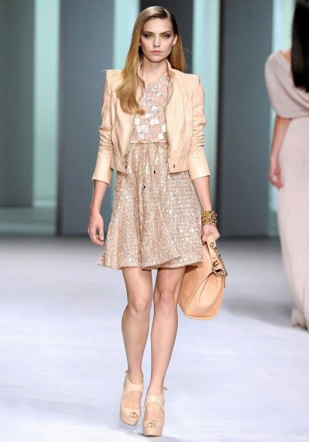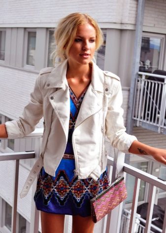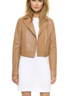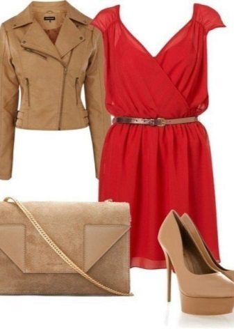 - Short beige leather jacket with a bright red dress. Long earrings and a clutch to match the dress will help to emphasize. High-heeled shoes to match the jacket will add harmony to the image.