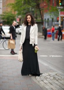 For office style black pants, a white strict blouse and a beige jacket are suitable. A silver necklace will add luxury.