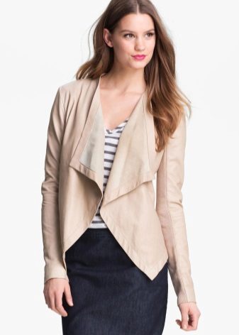 The beige leather jacket harmonizes beautifully with different color schemes, as well as with a variety of wardrobe elements. She will help to create a stylish bow in any style, to give attractiveness and charm.