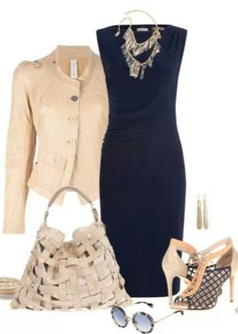- A blue pencil dress with beige leather looks irresistible. Beige stiletto sandals will showcase your femininity. And massive accessories will beautifully complement the silhouette.