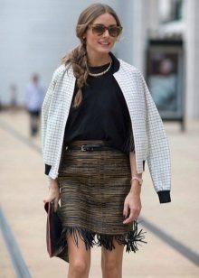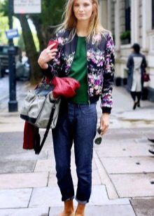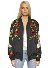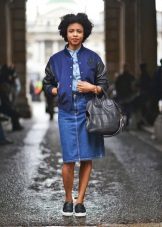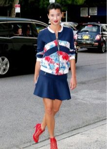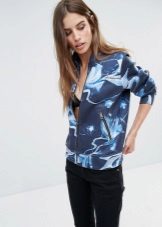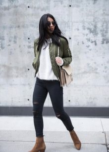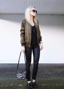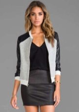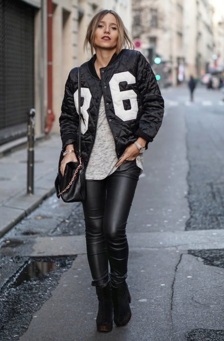 Combined bomber jacket model. In addition to the classic version of solid fabric, combined options have now become fashionable. Bomber jackets are found with leather sleeves, inserts, various prints, embroidery or stripes.