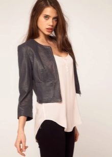 A short jacket with a shortened sleeve can be worn with a T-shirt or tunic, which will be visible from under the outer clothing. This way you can use layering that is back in fashion again. This model perfectly suits slender and thin girls, because it helps to hide the thinness of the figure.