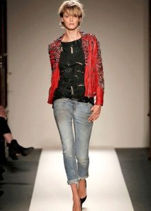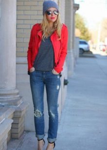Also, a beautiful ensemble creates a red jacket with ripped jeans or fashionable trousers. When choosing a color scheme, you can focus on the model of black, brown, blue, beige, white or blue.
