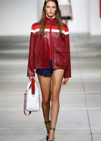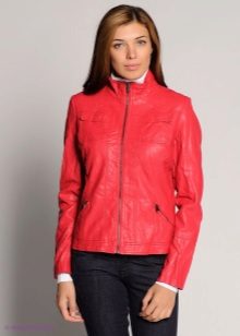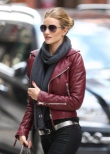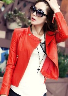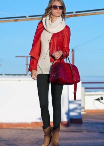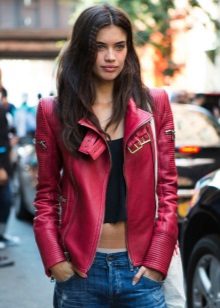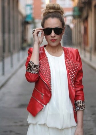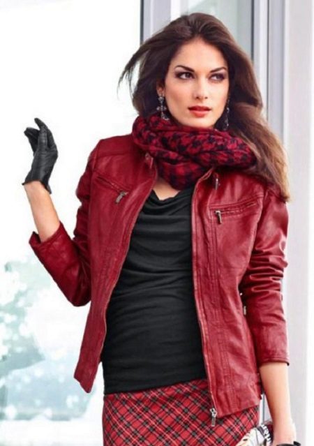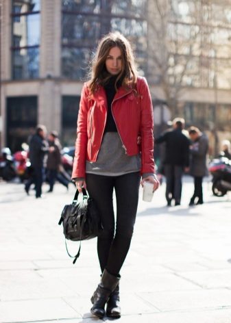 You can safely combine a red leather jacket with wardrobe elements in white, gray or black.She harmoniously looks in combination with tops, blouses, jumpers and even dresses.