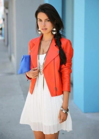 To embody an attractive image, a red jacket should be worn with a multi-layered mini-length dress in white. A good addition will be short boots or ankle boots with stable heels.