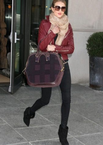 Another fashionable silhouette can be created with a red leather jacket if you wear it with black skinny, a white blouse and ankle boots with a small heel. A large bag and a black hat add practicality to the look.